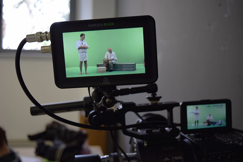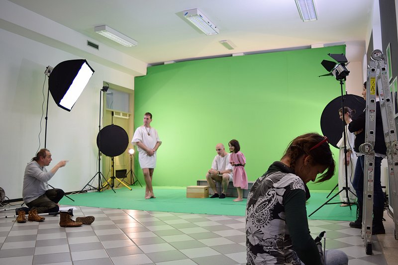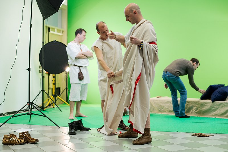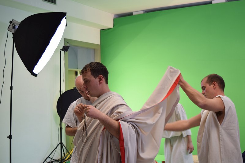 Kratek igrani prizor so igralci uprizorili pred zelenim ozadjem, ki ga bomo v postprodukciji nadomestili z drugo podlago. S kostumi in opremo so pri snemanju sodelovali člani društva Vespesjan, ki s ponazoritvami življenja v preteklosti širijo znanje o zgodovini – predvsem o starem Rimu.